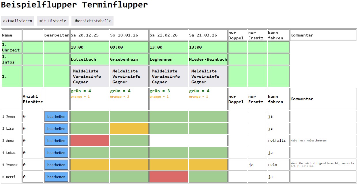 Hier haben sich die Spieler bereits eingetragen und ihre Verfügbarkeit für jeden Spieltermin angegeben.